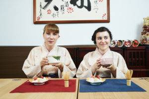 Wagashi txiav & Tshuaj yej ceremony. Koj yuav ua ib qho Japanese confectionery thiab ntsuab tshuaj yej. Koj tuaj yeem paub cov tshuaj yej kev lom zem nrog lub confectionery koj tau ua.