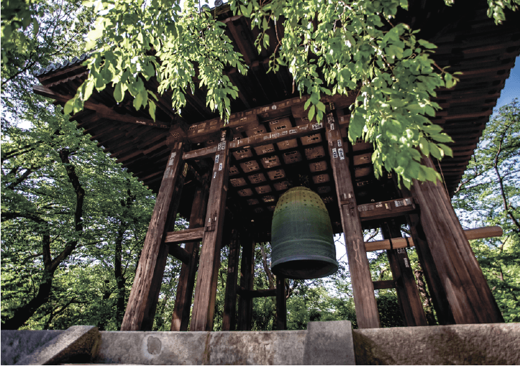 Bonsho: Buddhist bell. Temples have these bells to tell the time or to call the priests for the prayer. Sometimes it was used in the battles to communicate. On the new year's day, the bell is rung 108 times to rid of the 108 big sins in Buddhism. The dots on the bell also represent big sins.