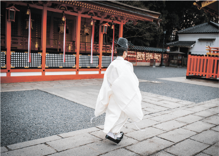 Miko: Maidens serving the shrine. Young girls with a vermillion color skirt and white dress. They were originally considered to be shamans who can communicate with deities. Nowadays they do the sacred cleansing, ceremonial dance, etc.