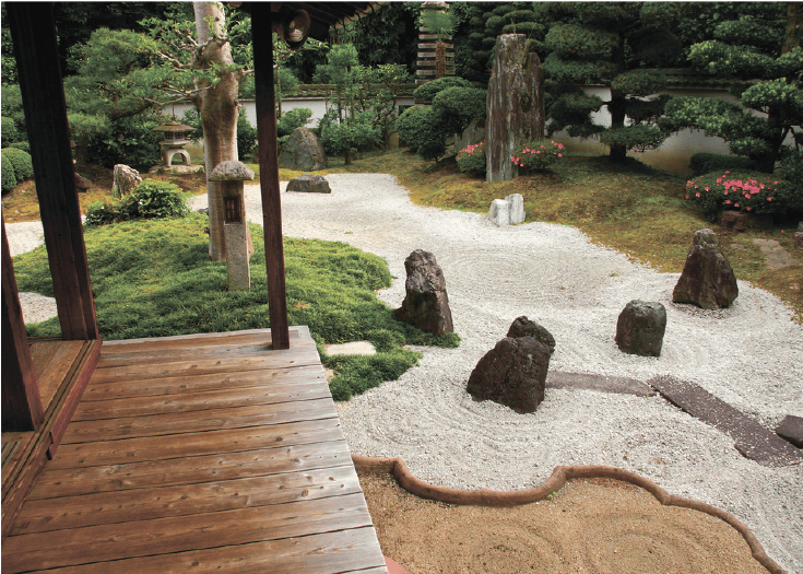 Rock Gardens (Karesansui): Gardens that are built to represent the universe (ripples*waves, big stones: islands, small stones: mountains and hills, green moss: forest, etc.) usually found at the temples, not shrines. Most rock gardens were built during the Muromachi period. During the late Edo and Meiji periods, green gardens were most common.