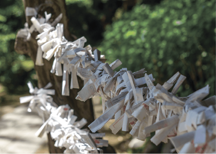 Omikuji amulets: These are white papers that may have good fortune and bad fortune written on them. One picks without seeing the fortune. If it is good fortune it should be kept in the bag, if it is bad fortune it should be tied to a tree to let the bad fortune go away. Nowadays both good and bad fortune papers are tied to trees or wires in shrines and temples.