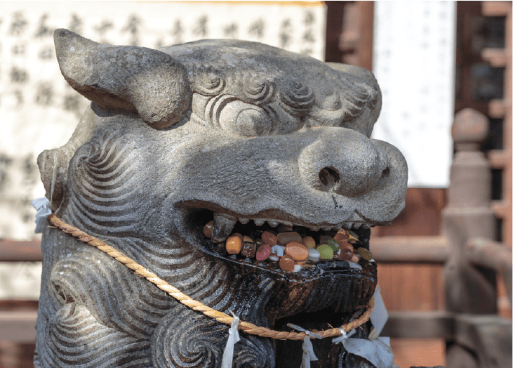 Koma Inu: Protective lion dogs. These two dogs are the guardians of the shrines. One of them has an open mouth and the other one has a closed mouth which represents the beginning and end. In the Fushimi Inari shrine, there are foxes instead of dogs.