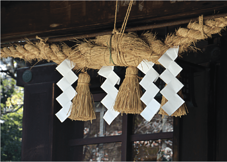 Shimenawa: Rice Straws and mulberry papers. These thick ropes are put around something purified or something sacred or something that houses a deity (e.g. a tree). The rope represents the straw the sun god Amaterasu hid. The white zig zag papers usually have 3 , 5, or 7 strips and represent the offerings for the deities.
