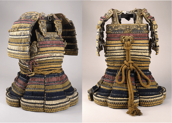 The yoroi is characterized by a cuirass that wraps around the body and is closed by a separate panel (waidate) on the right side and by a deep four-sided skirt. In use from around the tenth to the fourteenth century, yoroi were generally worn by warriors on horseback.