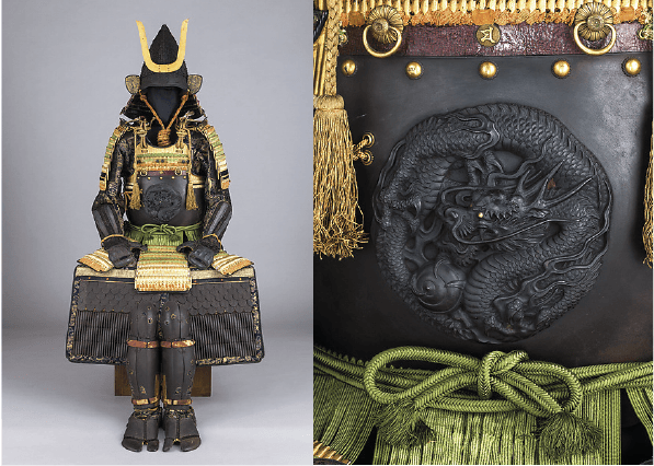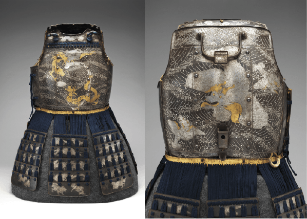 The breastplate is embossed in high relief with designs featuring a dragon and clouds. Made in late 18th–19th century in Japan.
