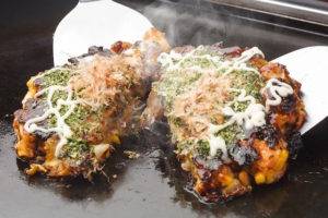 Okonomiyaki is a kind of savory meat pancake that is made out of various ingredients including but not limited to nagaimo yam, dashi, red ginger , green onion, eggs and butter. It is known as one of the two most famous famous local dishes of Osaka.